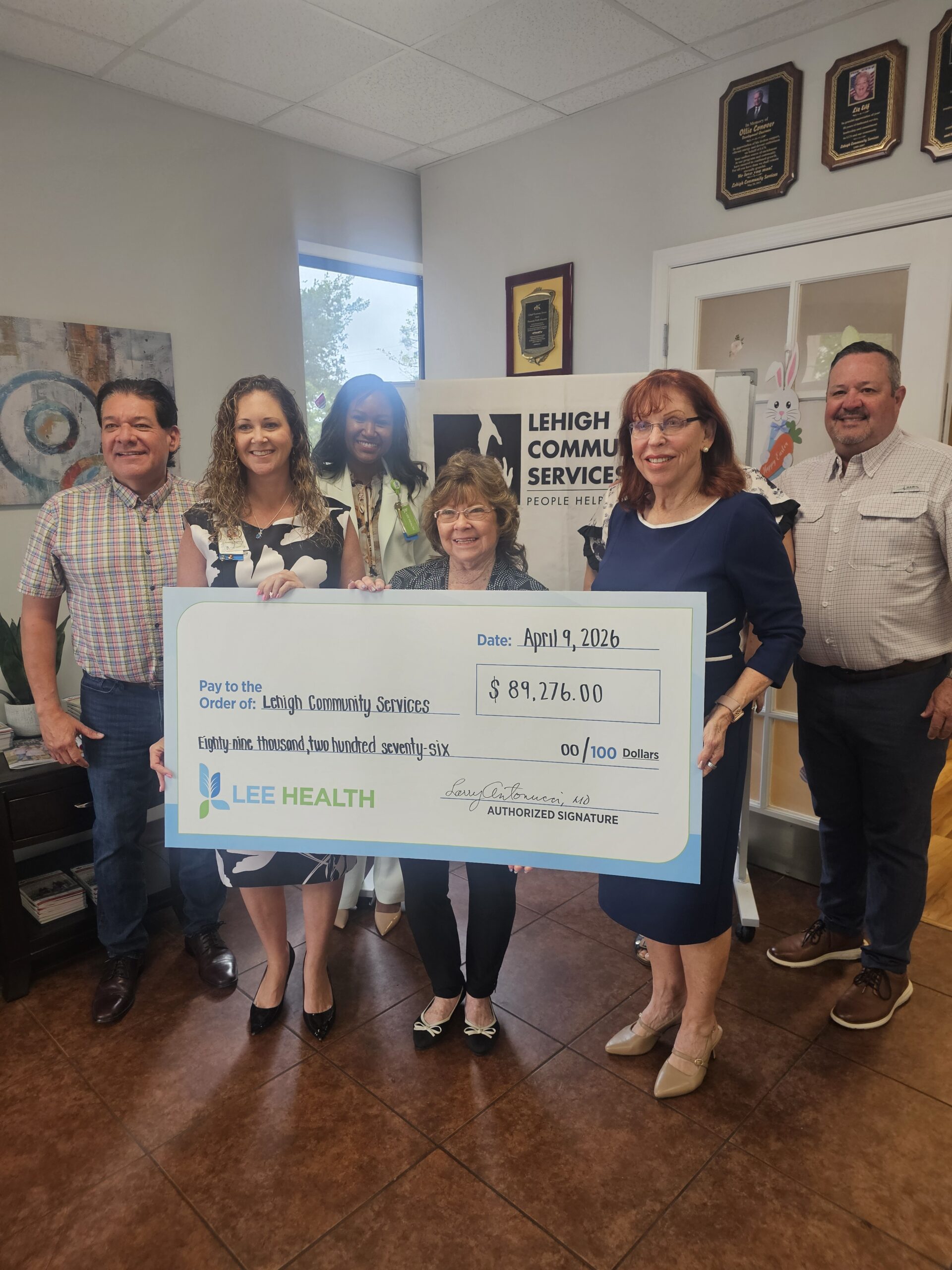 Al with the other members of Lehigh Community Services being presented with a check from Lee Health
